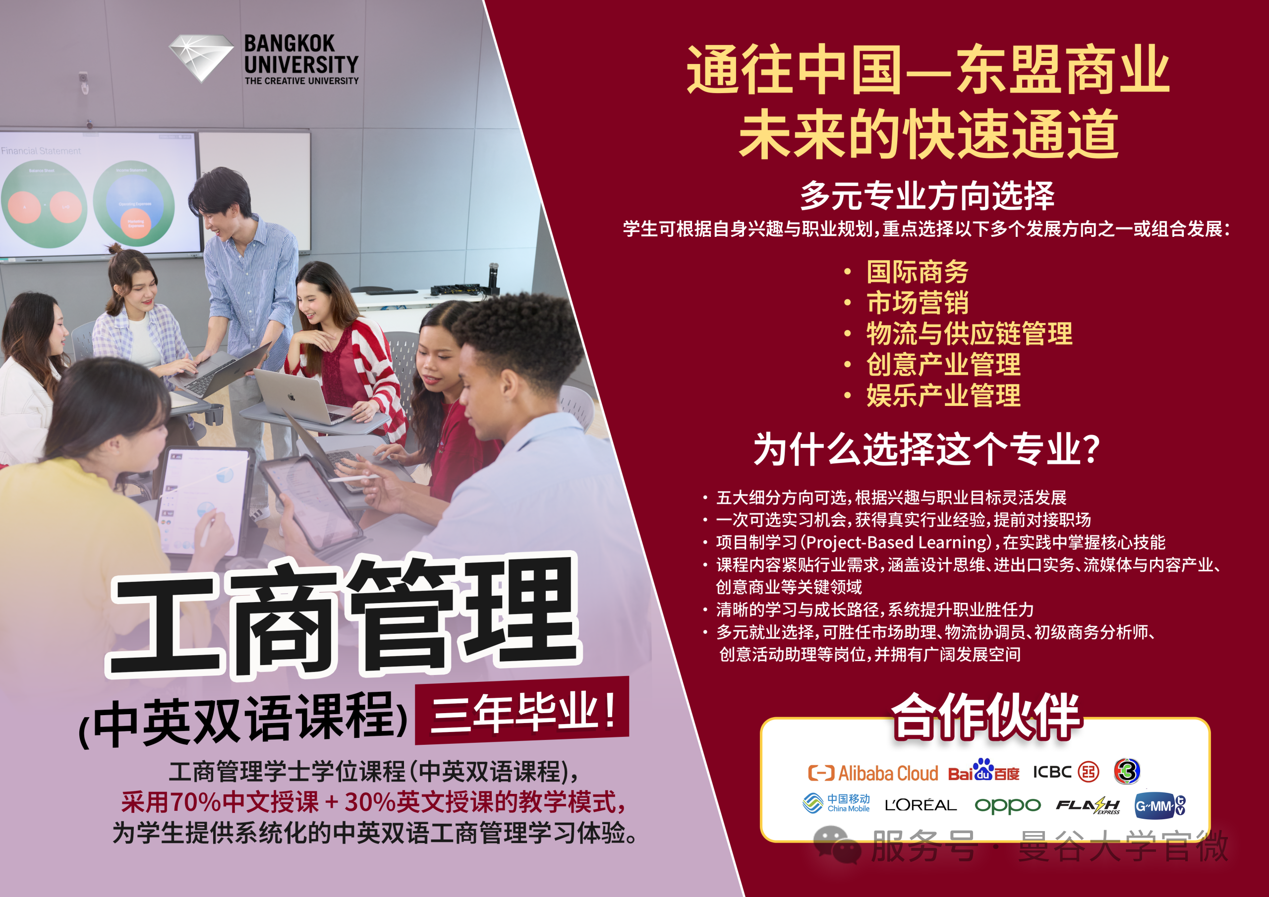 想在充满活力的中国-东盟商业圈脱颖而出?泰国曼谷大学国际学院推出的工商管理学士(中英双语项目)为你提供了一条高效的职场进阶之路。