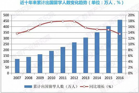 从1978年到2016年底,各类出国留学人员累计达458.66万人。其中136.25万人正在国外进行相关阶段的学习和研究;322.41万人已完成学业;265.11万人在完成学业后选择回国发展,占已完成学业群体的82.23%。