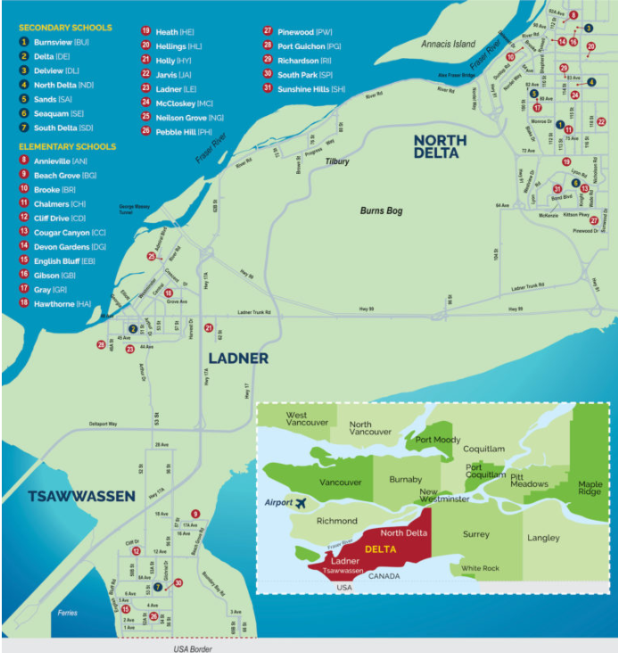 加拿大三角洲教育局距离温哥华30分钟车程、温哥华机场20分钟车程,紧邻美国边境,欢迎5至18岁的国际学生参与短期课程、全年课程及夏令营项目。
