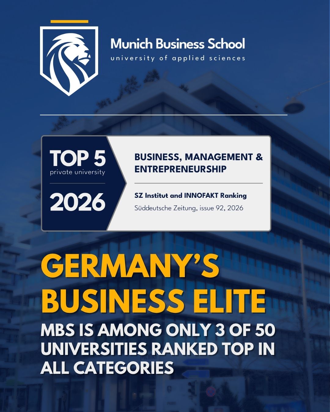 在最新发布的 2026 年《南德意志报》研究院「德国最佳私立大学」榜单中,慕尼黑商学院 斩获商业、管理与创业学科德国第 5 名,正式跻身德国顶尖私立商学院行列。本次排名共评估 50 所院校,仅有 8 所院校获此重磅评级,充分印证慕尼黑商学院商科教育的过硬品质与行业影响力。