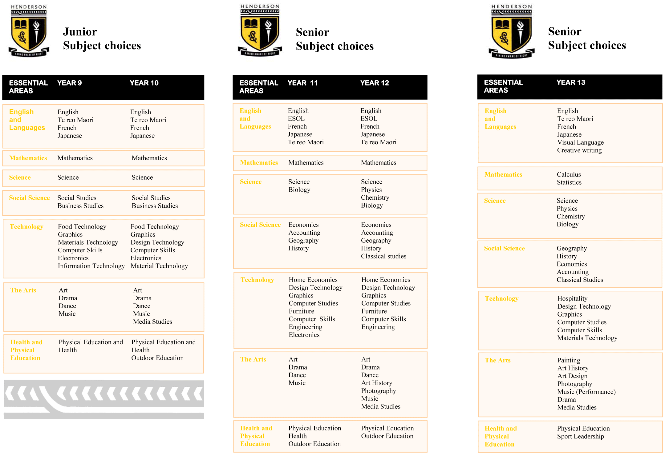 我们鼓励学生们为自己设定学业和职业上的目标,通过这些目标来激发学生进取的动力。就如所有新西兰的学府一般,亨德森高级中学开设教育部规定的所有基础课程。