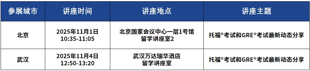 在即将开始的中国国际教育展会北京站,现场将进行额外的托福考试和GRE考试的最新动态分享讲座,手把手带你捋清托福和GRE考试的备考思路!往下滑动拿下讲座时间和地点安排,千万别错过!