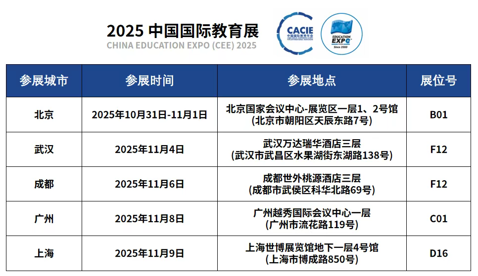 本次展会在五个城市进行展出,尽量为每个考生提供能够亲自到达现场的机会!北京站将于10月31日至11月1日在北京国家会议中心隆重举行,欢迎广大考生家长到场参与。